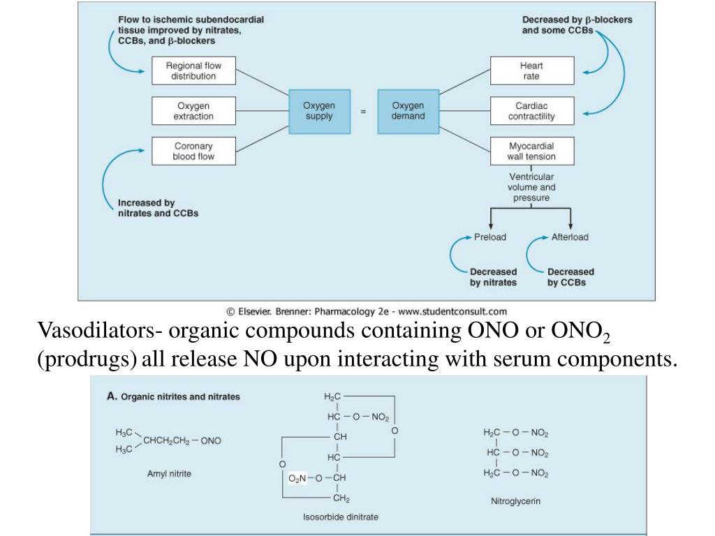 Vasodilators- organic compounds containing ONO or ONO2 (prodrugs)all release NO upon interacting with serum components.