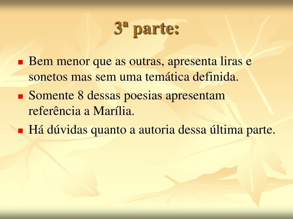 3ª parte: • Bem menor que as outras, apresenta liras e sonetos mas sem uma temática definida. • Somente 8 dessas poesias apresentam referência a Marília. • Há dúvidas quanto a autoria dessa última parte.