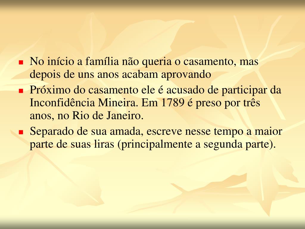No início a família não queria o casamento, mas depois de uns anos acabam aprovando • Próximo do casamento ele é acusado de participar da Inconfidência Mineira. Em 1789 é preso por três anos, no Rio de Janeiro. • Separado de sua amada, escreve nesse tempo a maior parte de suas liras (principalmente a segunda parte).