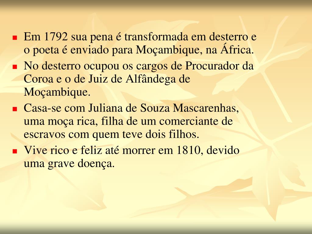 Em 1792 sua pena é transformada em desterro e o poeta é enviado para Moçambique, na África. • No desterro ocupou os cargos de Procurador da Coroa e o de Juiz de Alfândega de Moçambique. • Casa-se com Juliana de Souza Mascarenhas, uma moça rica, filha de um comerciante de escravos com quem teve dois filhos. • Vive rico e feliz até morrer em 1810, devido uma grave doença.
