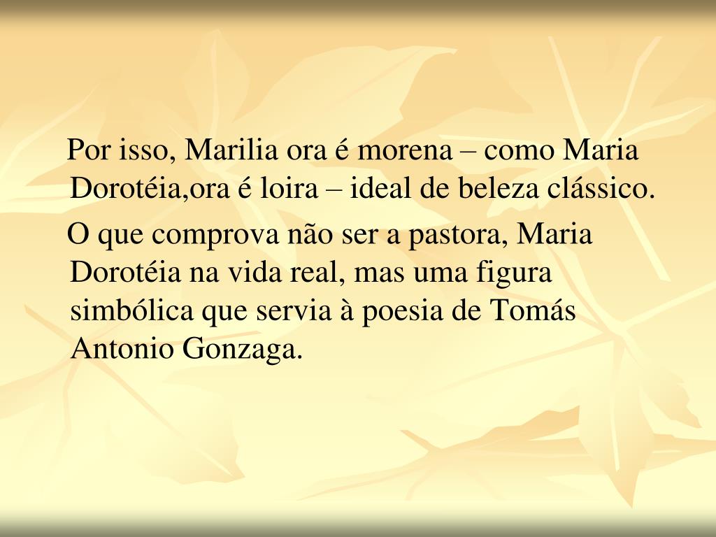 Por isso, Marilia ora é morena – como Maria Dorotéia,ora é loira – ideal de beleza clássico. O que comprova não ser a pastora, Maria Dorotéia na vida real, mas uma figura simbólica que servia à poesia de Tomás Antonio Gonzaga.