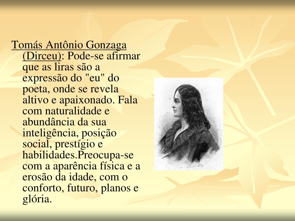 Tomás Antônio Gonzaga (Dirceu): Pode-se afirmar que as liras são a expressão do "eu" do poeta, onde se revela altivo e apaixonado. Fala com naturalidade e abundância da sua inteligência, posição social, prestígio e habilidades.Preocupa-se com a aparência física e a erosão da idade, com o conforto, futuro, planos e glória.