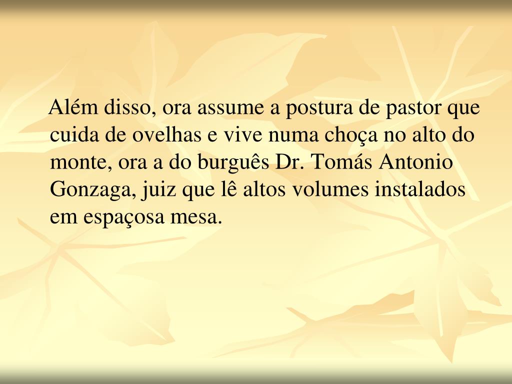 Além disso, ora assume a postura de pastor que cuida de ovelhas e vive numa choça no alto do monte, ora a do burguês Dr. Tomás Antonio Gonzaga, juiz que lê altos volumes instalados em espaçosa mesa.
