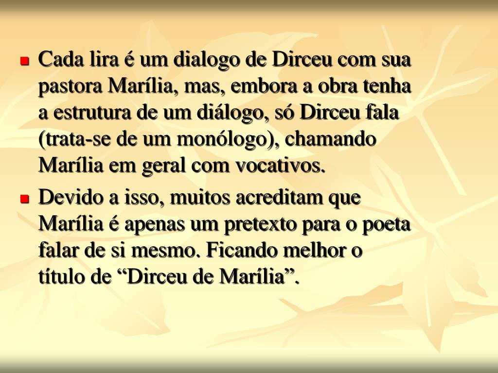 Cada lira é um dialogo de Dirceu com sua pastora Marília, mas, embora a obra tenha a estrutura de um diálogo, só Dirceu fala (trata-se de um monólogo), chamando Marília em geral com vocativos. • Devido a isso, muitos acreditam que Marília é apenas um pretexto para o poeta falar de si mesmo. Ficando melhor o título de “Dirceu de Marília”.