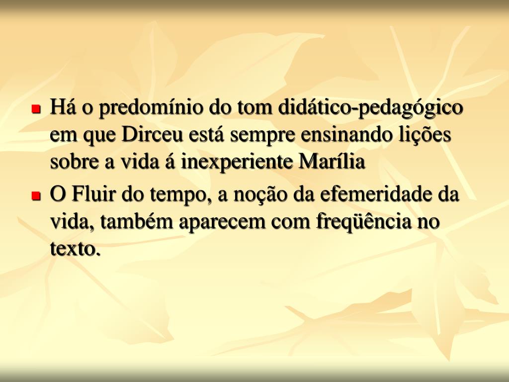 Há o predomínio do tom didático-pedagógico em que Dirceu está sempre ensinando lições sobre a vida á inexperiente Marília • O Fluir do tempo, a noção da efemeridade da vida, também aparecem com freqüência no texto.
