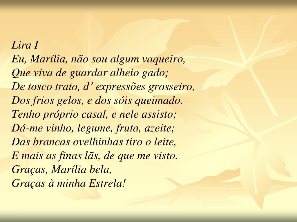 Lira I Eu, Marília, não sou algum vaqueiro, Que viva de guardar alheio gado; De tosco trato, d’ expressões grosseiro, Dos frios gelos, e dos sóis queimado. Tenho próprio casal, e nele assisto; Dá-me vinho, legume, fruta, azeite; Das brancas ovelhinhas tiro o leite, E mais as finas lãs, de que me visto. Graças, Marília bela, Graças à minha Estrela!