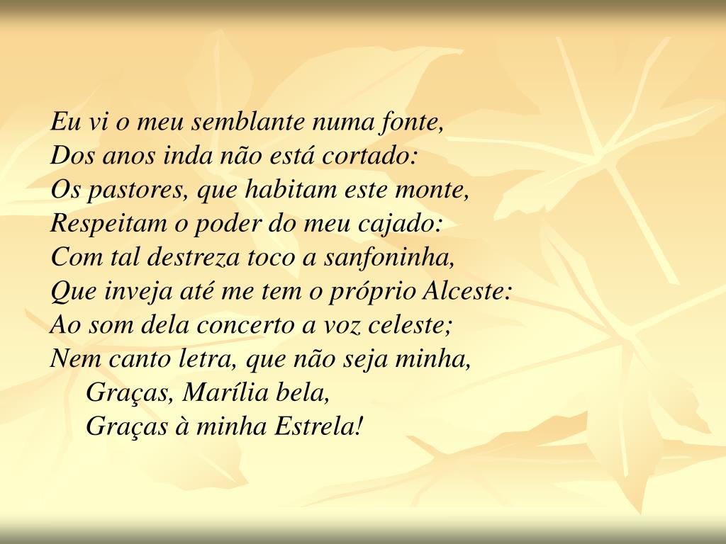 Eu vi o meu semblante numa fonte, Dos anos inda não está cortado: Os pastores, que habitam este monte, Respeitam o poder do meu cajado: Com tal destreza toco a sanfoninha, Que inveja até me tem o próprio Alceste: Ao som dela concerto a voz celeste; Nem canto letra, que não seja minha, Graças, Marília bela, Graças à minha Estrela!