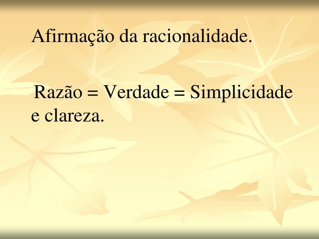Afirmação da racionalidade. Razão = Verdade = Simplicidade e clareza.