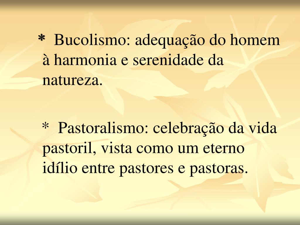 * Bucolismo: adequação do homem à harmonia e serenidade da natureza. * Pastoralismo: celebração da vida pastoril, vista como um eterno idílio entre pastores e pastoras.