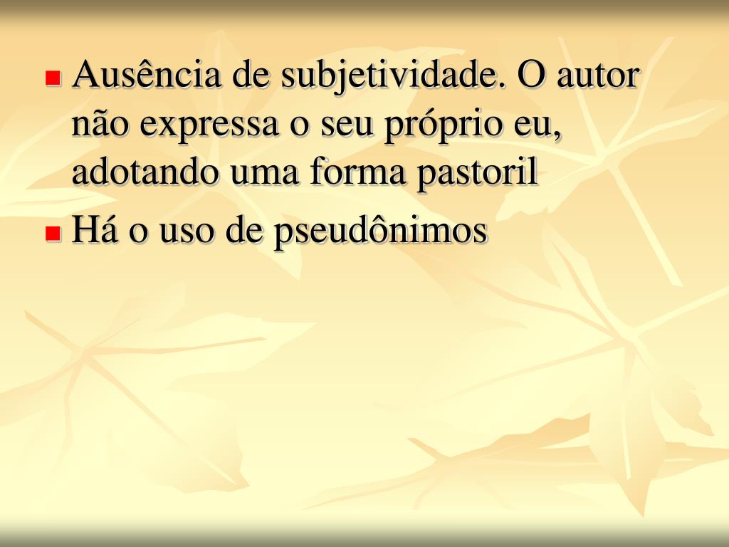 Ausência de subjetividade. O autor não expressa o seu próprio eu, adotando uma forma pastoril • Há o uso de pseudônimos
