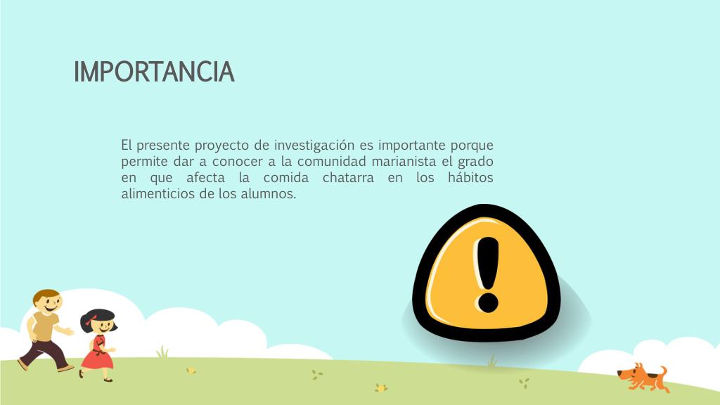 IMPORTANCIA El presente proyecto de investigación es importante porque permite dar a conocer a la comunidad marianista el grado en que afecta la comida chatarra en los hábitos alimenticios de los alumnos.