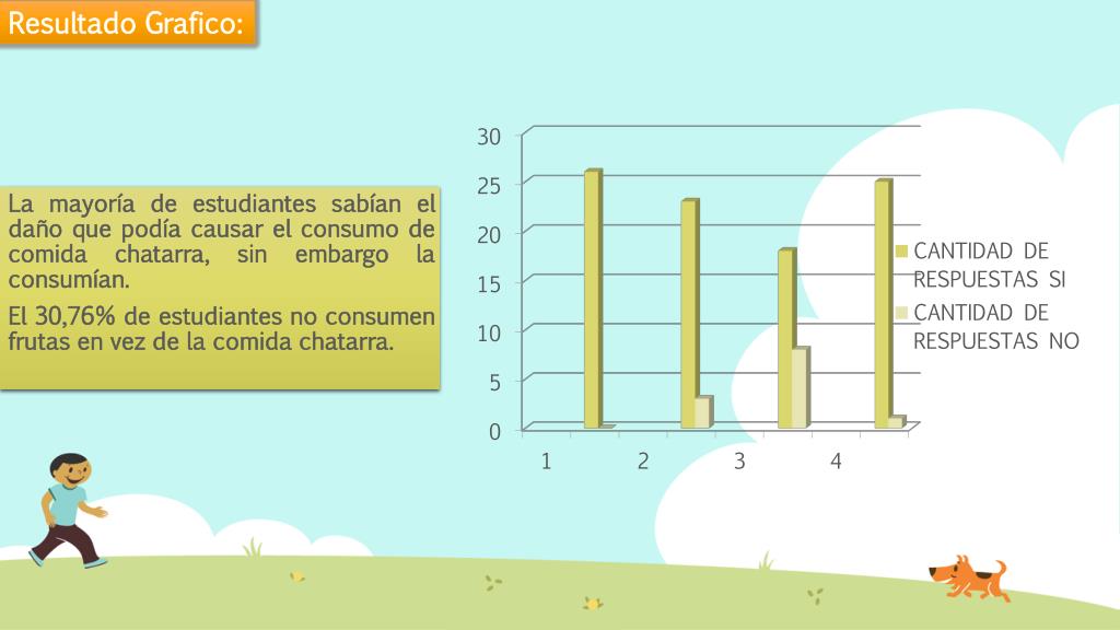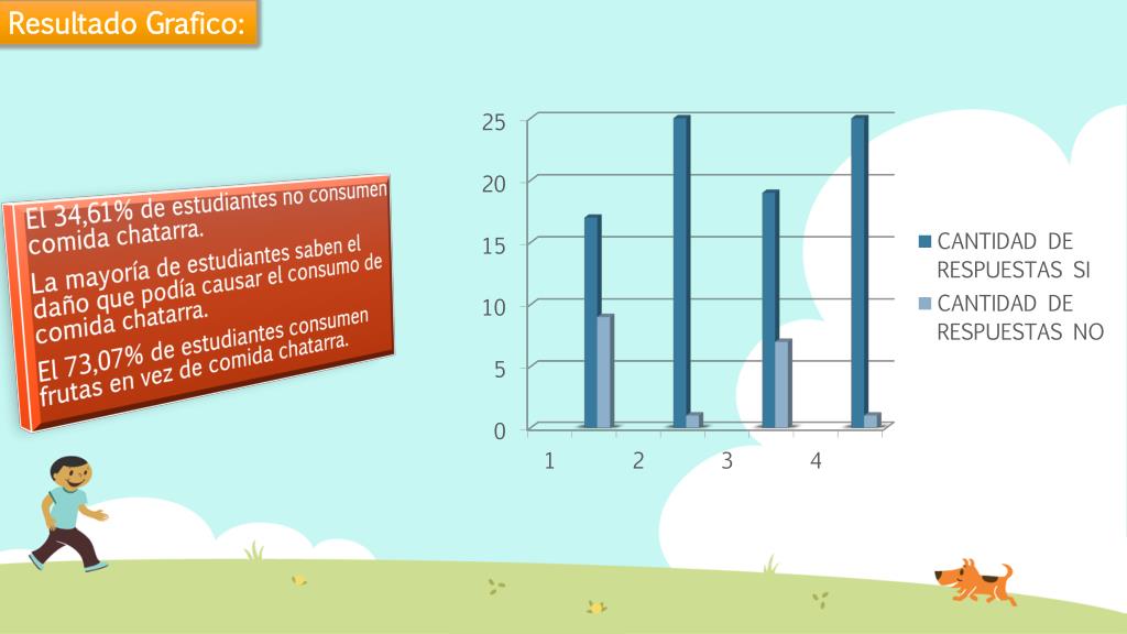 Resultado Grafico: El 34,61% de estudiantes no consumen comida chatarra. La mayoría de estudiantes saben el daño que podía causar el consumo de comida chatarra. El 73,07% de estudiantes consumen frutas en vez de comida chatarra.