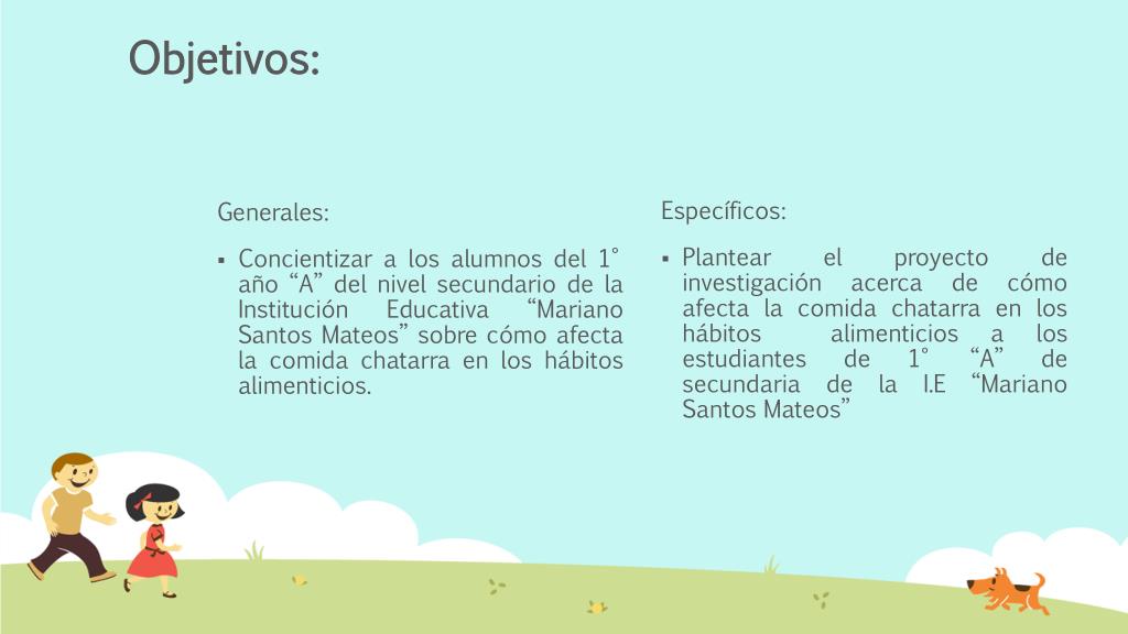 Objetivos: Específicos: • Plantear el proyecto de investigación acerca de cómo afecta la comida chatarra en los hábitos alimenticios a los estudiantes de 1° “A” de secundaria de la I.E “Mariano Santos Mateos” Generales: • Concientizar a los alumnos del 1° año “A” del nivel secundario de la Institución Educativa “Mariano Santos Mateos” sobre cómo afecta la comida chatarra en los hábitos alimenticios.
