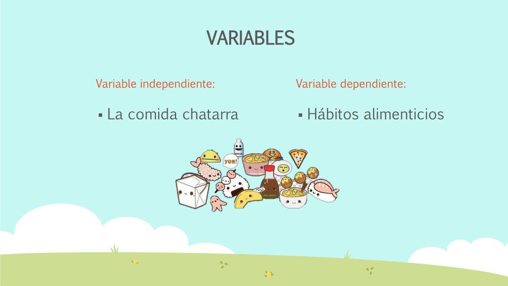 VARIABLES Variable independiente: Variable dependiente: Hábitos alimenticios • La comida chatarra