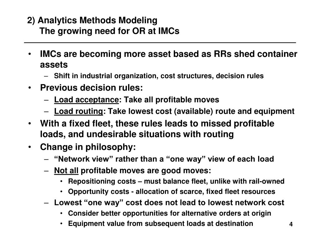 2) Analytics Methods Modeling The growing need for OR at IMCs • IMCs are becoming more asset based as RRs shed container assets • Shift in industrial organization, cost structures, decision rules • Previous decision rules: • Load acceptance: Take all profitable moves • Load routing: Take lowest cost (available) route and equipment • With a fixed fleet, these rules leads to missed profitable loads, and undesirable situations with routing • Change in philosophy: • “Network view” rather than a “one way” view of each load • Not all profitable moves are good moves: • Repositioning costs – must balance fleet, unlike with rail-owned • Opportunity costs - allocation of scarce, fixed fleet resources • Lowest “one way” cost does not lead to lowest network cost • Consider better opportunities for alternative orders at origin • Equipment value from subsequent loads at destination