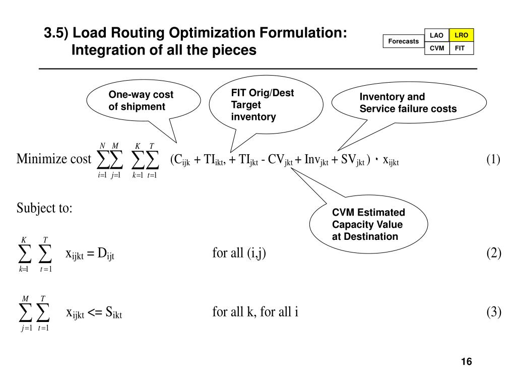 3.5) Load Routing Optimization Formulation: Integration of all the pieces LRO LAO Forecasts CVM FIT FIT Orig/Dest Target inventory One-way cost of shipment Inventory and Service failure costs CVM Estimated Capacity Value at Destination