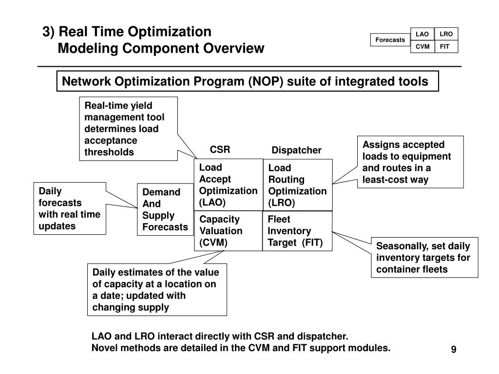 3) Real Time Optimization: Technological Architecture Overview and Information Flow Production Transaction System User Interface Business Process LoadAccept Optimization Load Routing Optimization Network Optimization Program (NOP) Demand And Supply Forecasts Capacity Valuation Model Fleet Inventory Targets Fleet Allocation Model