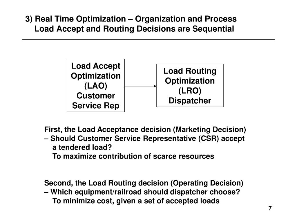 3) Real Time Optimization – Organization and Process Load Accept and Routing Decisions are Sequential Load Accept Optimization (LAO) Customer Service Rep Load Routing Optimization (LRO) Dispatcher • First, the Load Acceptance decision (Marketing Decision) • – Should Customer Service Representative (CSR) accept • a tendered load? To maximize contribution of scarce resources • Second, the Load Routing decision (Operating Decision) • – Which equipment/railroad should dispatcher choose? • To minimize cost, given a set of accepted loads