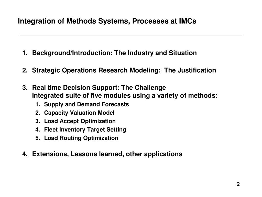 Integration of Methods Systems, Processes at IMCs • Background/Introduction: The Industry and Situation • Strategic Operations Research Modeling: The Justification • Real time Decision Support: The ChallengeIntegrated suite of five modules using a variety of methods: • Supply and Demand Forecasts • Capacity Valuation Model • Load Accept Optimization • Fleet Inventory Target Setting • Load Routing Optimization • Extensions, Lessons learned, other applications