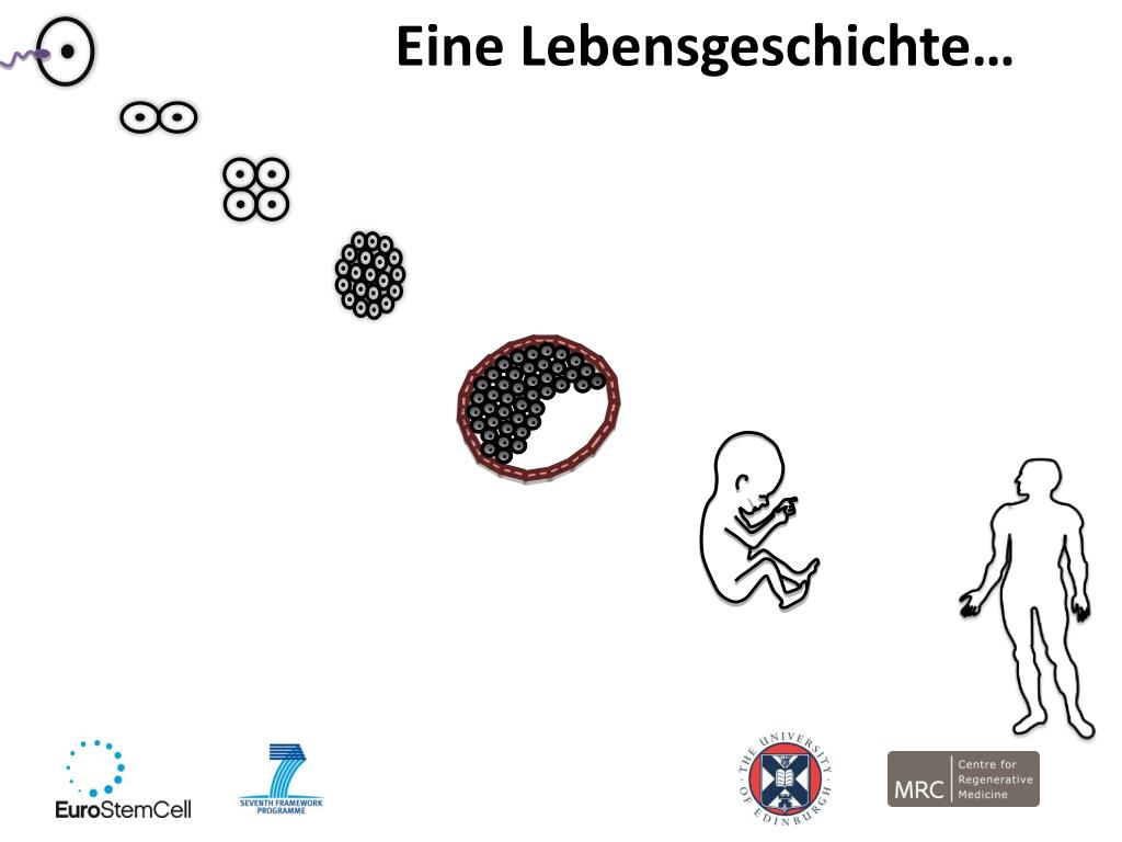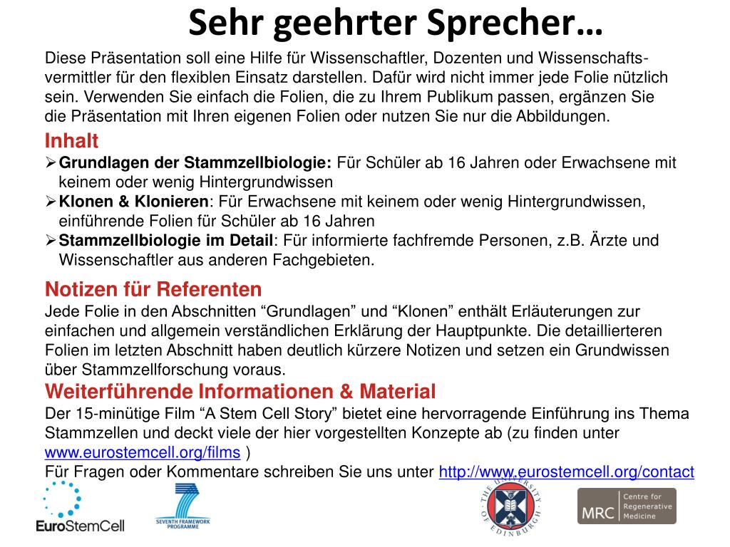 Sehr geehrter Sprecher… Diese Präsentation soll eine Hilfe für Wissenschaftler, Dozenten und Wissenschafts-vermittler für den flexiblen Einsatz darstellen. Dafür wird nicht immer jede Folie nützlich sein. Verwenden Sie einfach die Folien, die zu Ihrem Publikum passen, ergänzen Sie die Präsentation mit Ihren eigenen Folien oder nutzen Sie nur die Abbildungen. Inhalt • Grundlagen der Stammzellbiologie: Für Schüler ab 16 Jahren oder Erwachsene mit keinem oder wenig Hintergrundwissen • Klonen & Klonieren: Für Erwachsene mit keinem oder wenig Hintergrundwissen, einführende Folien für Schüler ab 16 Jahren • Stammzellbiologie im Detail: Für informierte fachfremde Personen, z.B. Ärzte und Wissenschaftler aus anderen Fachgebieten. Notizen für Referenten Jede Folie in den Abschnitten “Grundlagen” und “Klonen” enthält Erläuterungen zur einfachen und allgemein verständlichen Erklärung der Hauptpunkte. Die detaillierteren Folien im letzten Abschnitt haben deutlich kürzere Notizen und setzen ein Grundwissen über Stammzellforschung voraus. Weiterführende Informationen & Material Der 15-minütige Film “A Stem Cell Story” bietet eine hervorragende Einführung ins Thema Stammzellen und deckt viele der hier vorgestellten Konzepte ab (zu finden unter www.eurostemcell.org/films ) Für Fragen oder Kommentare schreiben Sie uns unter http://www.eurostemcell.org/contact