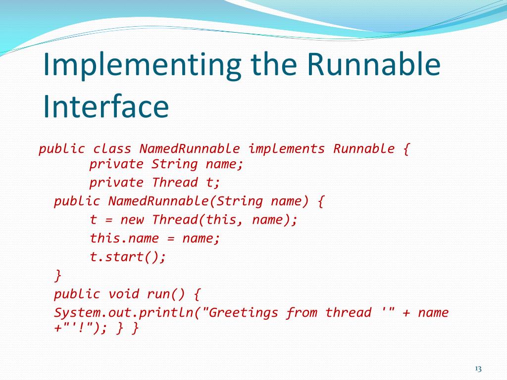 Implementing the RunnableInterface public class NamedRunnable implements Runnable { private String name; private Thread t; public NamedRunnable(String name) { t = new Thread(this, name); this.name = name; t.start(); } public void run() { System.out.println("Greetings from thread '" + name +"'!"); } }