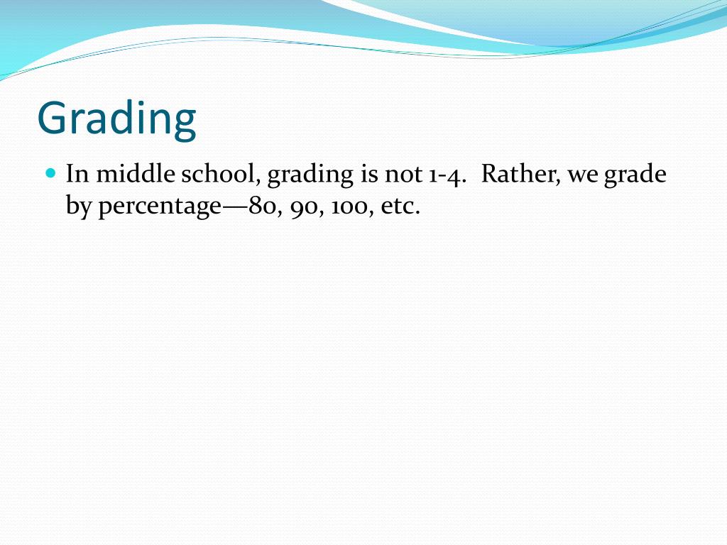 Grading • In middle school, grading is not 1-4. Rather, we grade by percentage—80, 90, 100, etc.