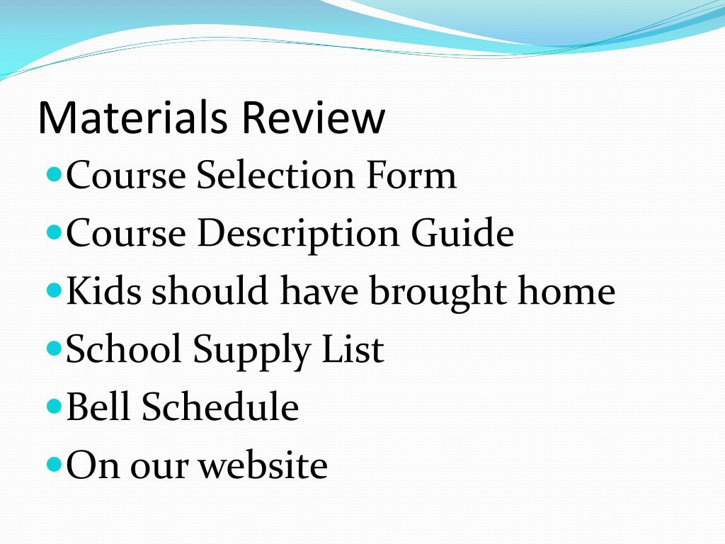 Materials Review • Course Selection Form • Course Description Guide • Kids should have brought home • School Supply List • Bell Schedule • On our website