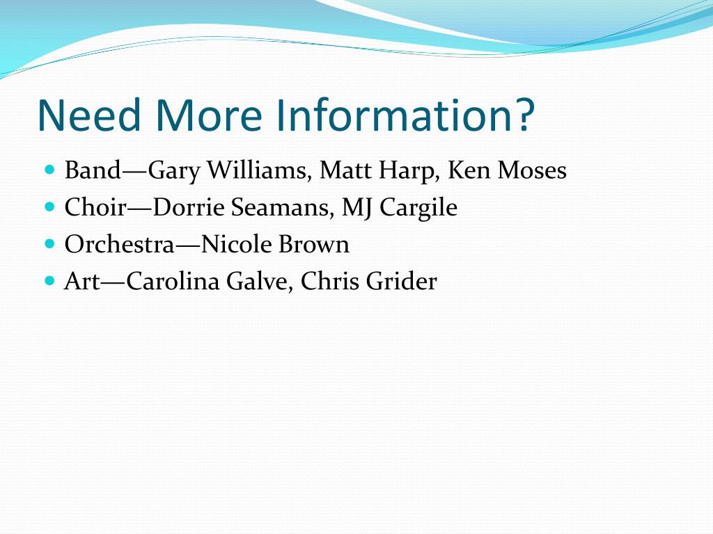 Need More Information? • Band—Gary Williams, Matt Harp, Ken Moses • Choir—Dorrie Seamans, MJ Cargile • Orchestra—Nicole Brown • Art—Carolina Galve, Chris Grider