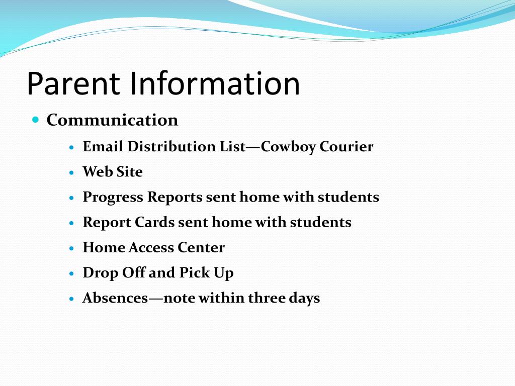 Parent Information • Communication • Email Distribution List—Cowboy Courier • Web Site • Progress Reports sent home with students • Report Cards sent home with students • Home Access Center • Drop Off and Pick Up • Absences—note within three days