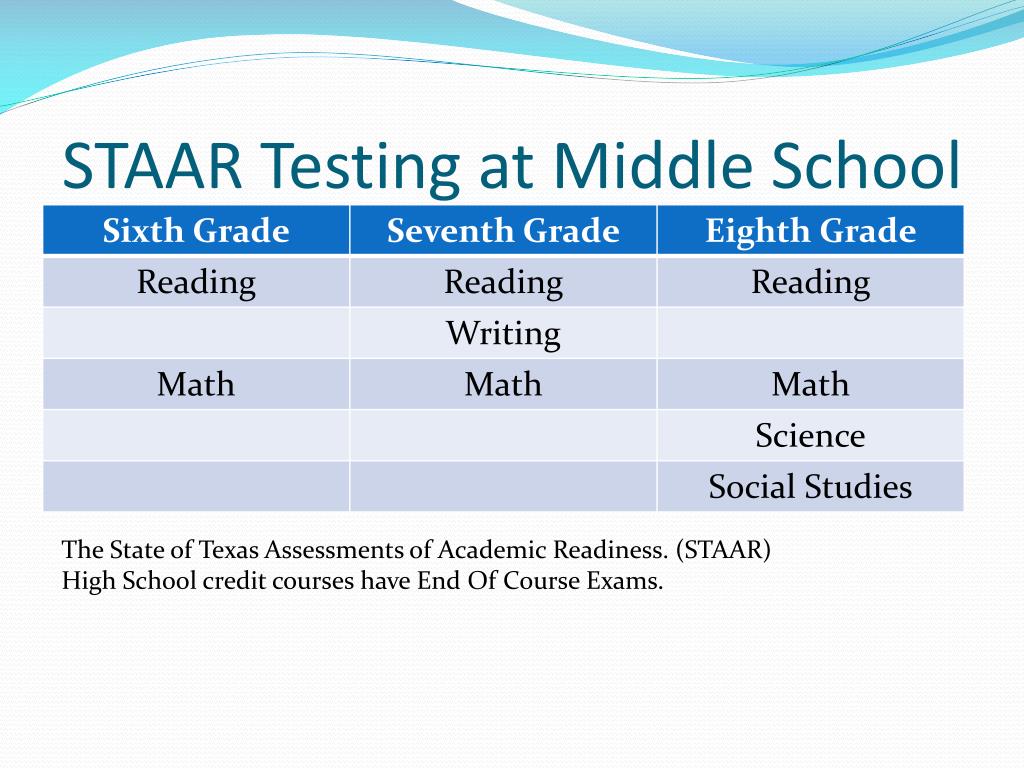 STAAR Testing at Middle School The State of Texas Assessments of Academic Readiness. (STAAR) High School credit courses have End Of Course Exams.