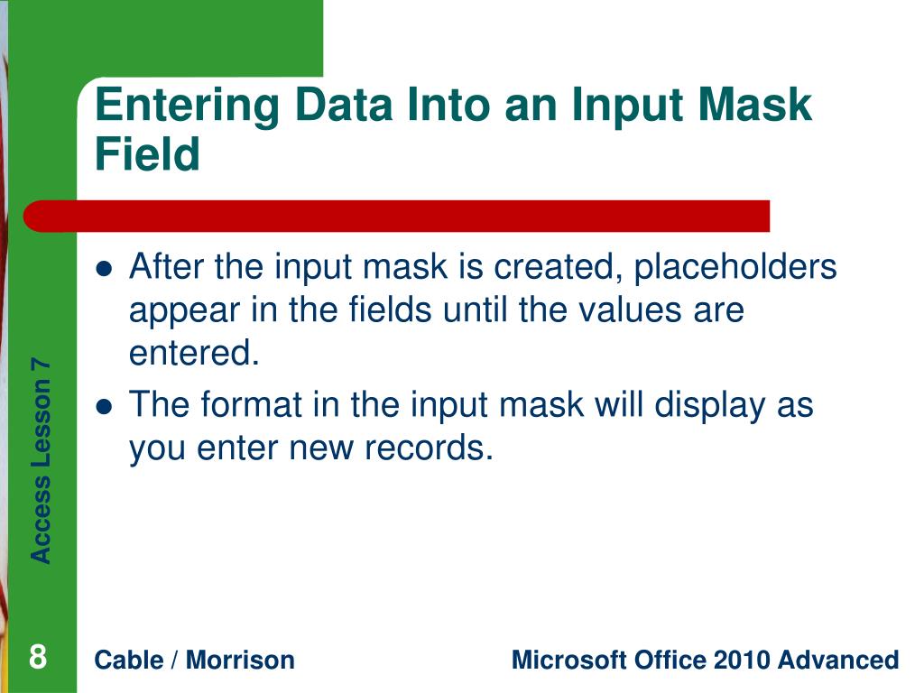 Access Lesson 7 Enhancing Table Design. Microsoft Office 2010 Advanced. Cable / Morrison. Objectives. Create an input mask. Enter data in an input mask field. Set validation rules. Enter data into a field with a validation rule. Set a lookup property. 2. 2. Objectives (continued).