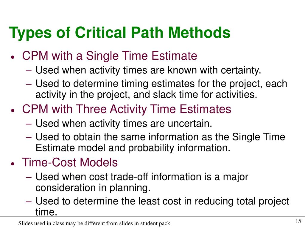Types of Critical Path Methods • CPM with a Single Time Estimate • Used when activity times are known with certainty. • Used to determine timing estimates for the project, each activity in the project, and slack time for activities. • CPM with Three Activity Time Estimates • Used when activity times are uncertain. • Used to obtain the same information as the Single Time Estimate model and probability information. • Time-Cost Models • Used when cost trade-off information is a major consideration in planning. • Used to determine the least cost in reducing total project time.