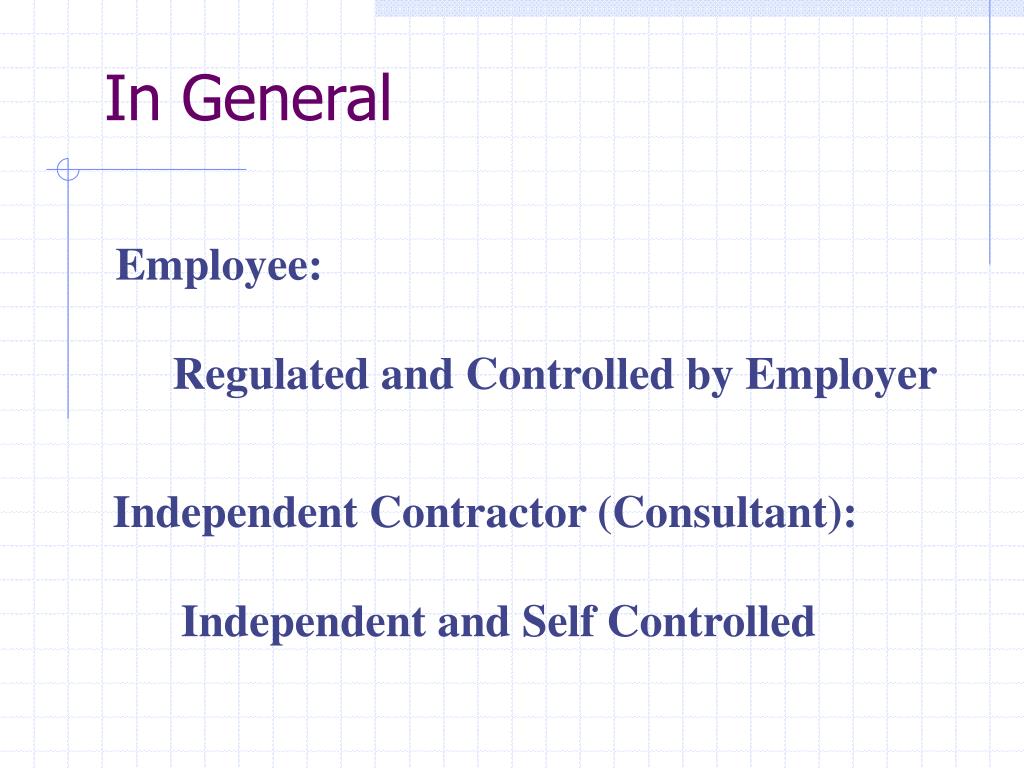 In General Employee: Regulated and Controlled by Employer Independent Contractor (Consultant): Independent and Self Controlled