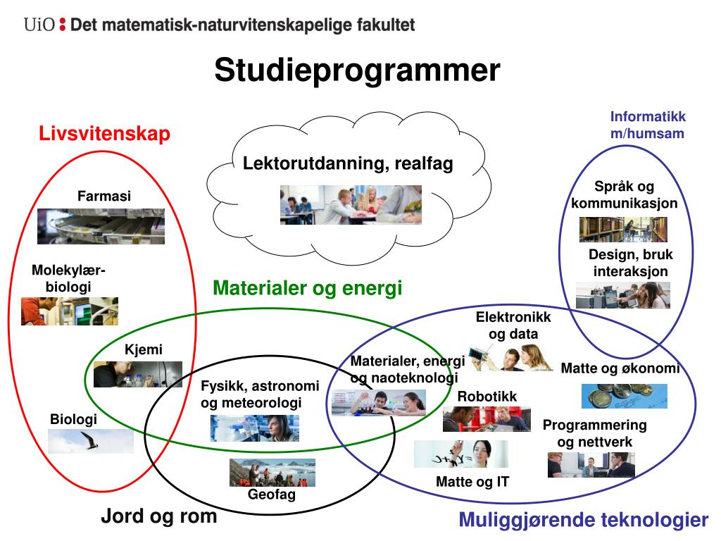 Studieprogrammer Informatikk m/humsam Livsvitenskap Lektorutdanning, realfag Språk og kommunikasjon Farmasi Design, bruk interaksjon Molekylær- biologi Materialer og energi Elektronikk og data Kjemi Materialer, energi og naoteknologi Matte og økonomi Fysikk, astronomi og meteorologi Robotikk Biologi Programmering og nettverk Matte og IT Geofag Jord og rom Muliggjørende teknologier