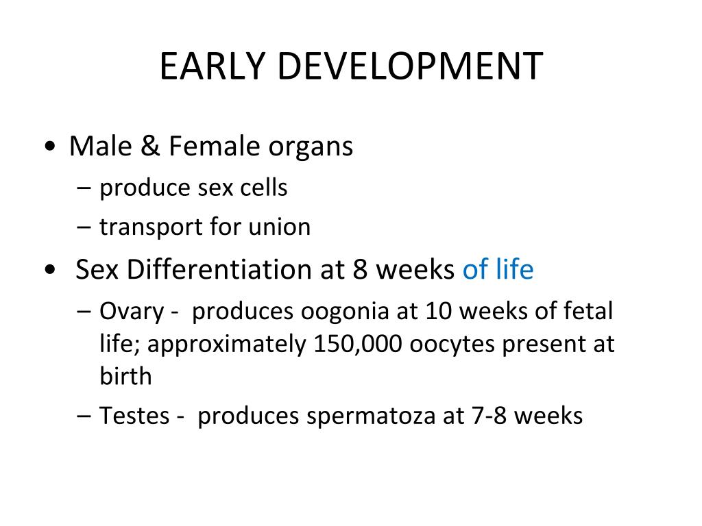 EARLY DEVELOPMENT • Male & Female organs • produce sex cells • transport for union • Sex Differentiation at 8 weeks of life • Ovary - produces oogonia at 10 weeks of fetal life; approximately 150,000 oocytes present at birth • Testes - produces spermatoza at 7-8 weeks