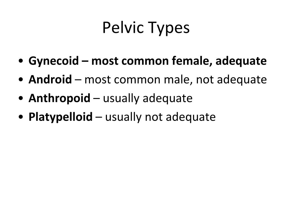 Pelvic Types • Gynecoid – most common female, adequate • Android – most common male, not adequate • Anthropoid – usually adequate • Platypelloid – usually not adequate