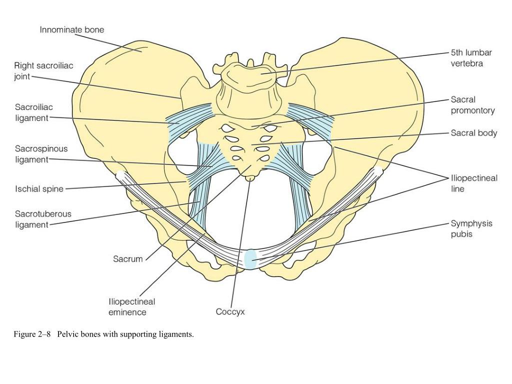 Bony Pelvis • Functions – to support and protect the internal organs of reproduction • Innominate Bones • Ilium – upper prominence of hip • Ischium – under the ilium, ends in ischial tuberosity, serves as reference point for station • Pubis – (2 separate bones) front of innominate, meets other to form symphysis pubis • Sacrum – 5 fused vertebrae, sacral promontory • Coccyx – (Tail bone) triangular bone last on vertebral column, moves backward in childbirth (Sometimes can get fx’d during childbirth)