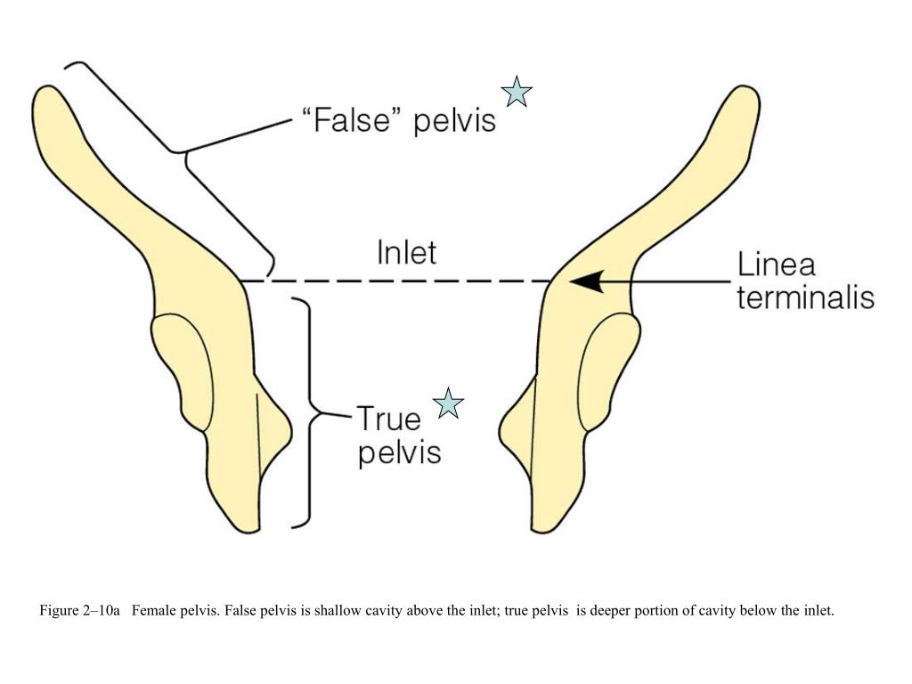 Figure 2–10a Female pelvis. False pelvis is shallow cavity above the inlet; true pelvis is deeper portion of cavity below the inlet.