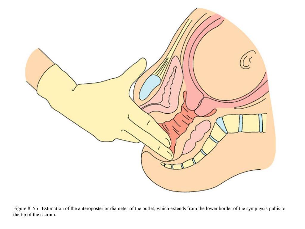 Figure 8–5b Estimation of the anteroposterior diameter of the outlet, which extends from the lower border of the symphysis pubis to the tip of the sacrum.