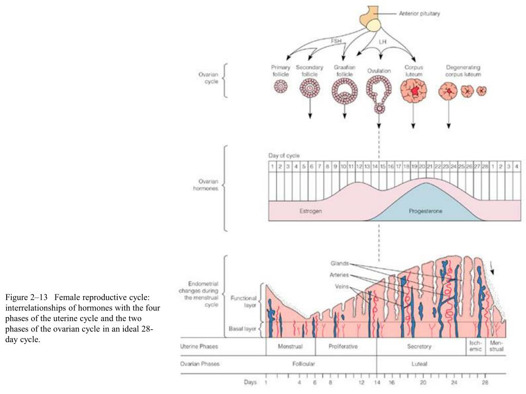 Figure 2–13 Female reproductive cycle: interrelationships of hormones with the four phases of the uterine cycle and the two phases of the ovarian cycle in an ideal 28-day cycle.