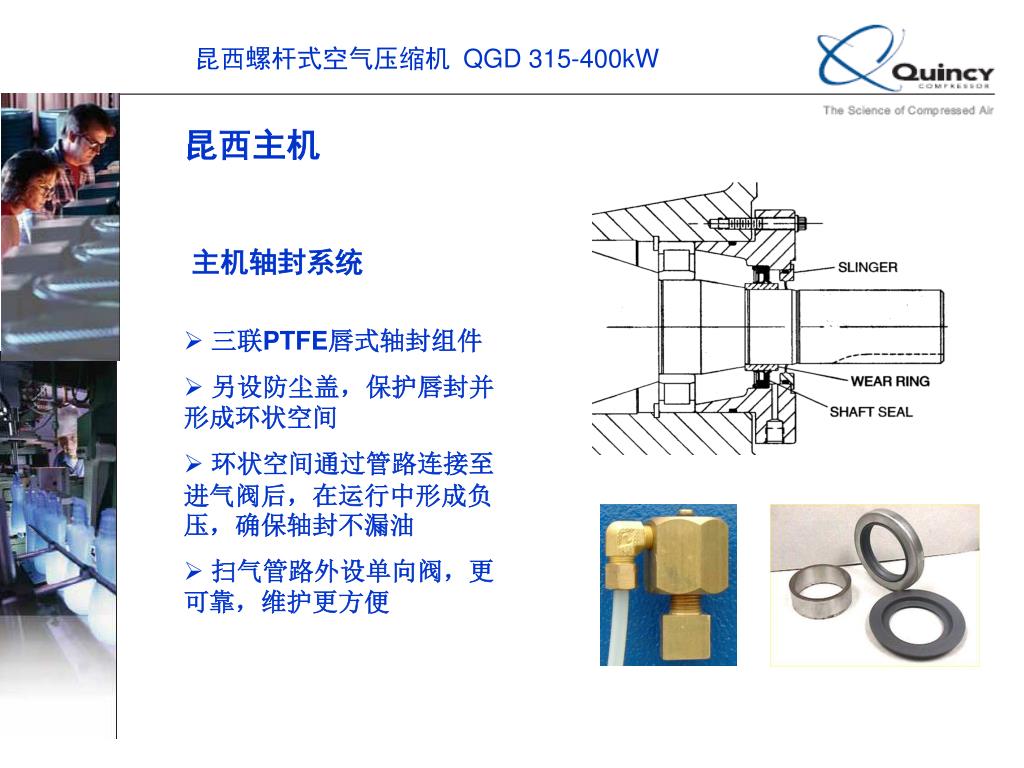 昆西螺杆式空气压缩机 QGD 315-400kW 昆西主机 主机轴封系统 • 三联PTFE唇式轴封组件 • 另设防尘盖,保护唇封并形成环状空间 • 环状空间通过管路连接至进气阀后,在运行中形成负压,确保轴封不漏油 • 扫气管路外设单向阀,更可靠,维护更方便