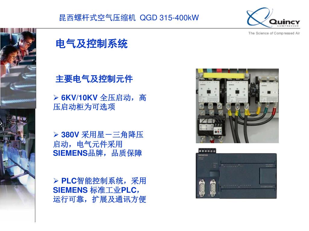 昆西螺杆式空气压缩机 QGD 315-400kW 电气及控制系统 主要电气及控制元件 • 6KV/10KV 全压启动,高压启动柜为可选项 • 380V 采用星-三角降压启动,电气元件采用SIEMENS品牌,品质保障 • PLC智能控制系统,采用SIEMENS 标准工业PLC,运行可靠,扩展及通讯方便
