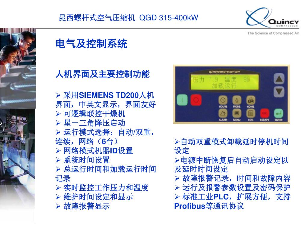 昆西螺杆式空气压缩机 QGD 315-400kW 电气及控制系统 人机界面及主要控制功能 • 采用SIEMENS TD200人机界面,中英文显示,界面友好 • 可逻辑联控干燥机 • 星-三角降压启动 • 运行模式选择:自动/双重,连续,网络(6台) • 网络模式机器ID设置 • 系统时间设置 • 总运行时间和加载运行时间记录 • 实时监控工作压力和温度 • 维护时间设定和显示 • 故障报警显示 • 自动双重模式卸载延时停机时间设定 • 电源中断恢复后自动启动设定以及延时时间设定 • 故障报警记录,时间和故障内容 • 运行及报警参数设置及密码保护 • 标准工业PLC,扩展方便,支持Profibus等通讯协议