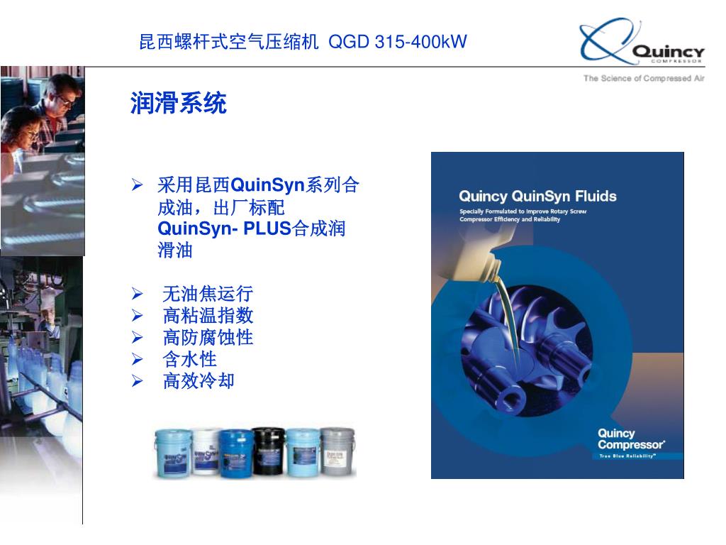 昆西螺杆式空气压缩机 QGD 315-400kW 润滑系统 • 采用昆西QuinSyn系列合成油,出厂标配QuinSyn- PLUS合成润滑油 • 无油焦运行 • 高粘温指数 • 高防腐蚀性 • 含水性 • 高效冷却