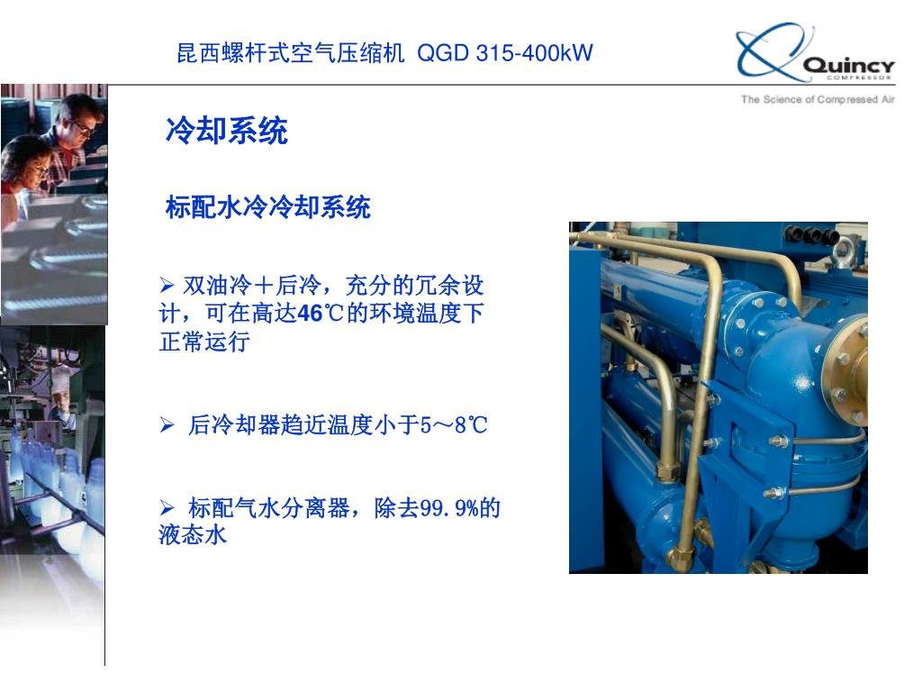 昆西螺杆式空气压缩机 QGD 315-400kW 冷却系统 标配水冷冷却系统 • 双油冷+后冷,充分的冗余设计,可在高达46℃的环境温度下正常运行 • 后冷却器趋近温度小于5~8℃ • 标配气水分离器,除去99.9%的液态水