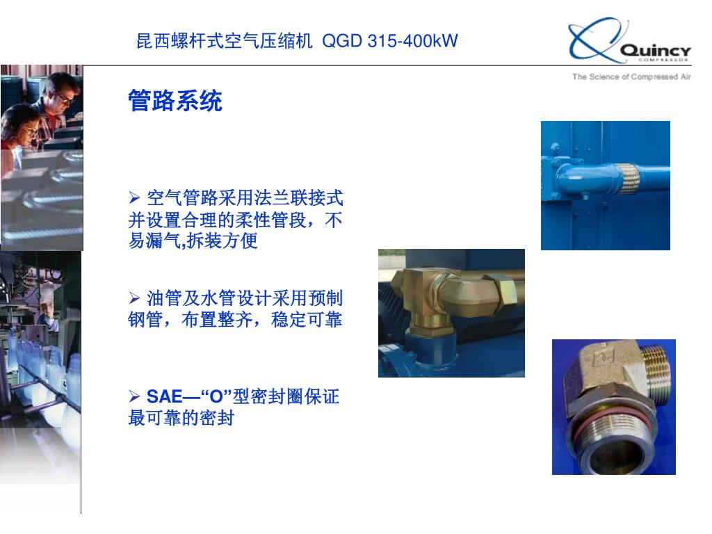 昆西螺杆式空气压缩机 QGD 315-400kW 管路系统 • 空气管路采用法兰联接式并设置合理的柔性管段,不易漏气,拆装方便 • 油管及水管设计采用预制钢管,布置整齐,稳定可靠 • SAE—“O”型密封圈保证最可靠的密封