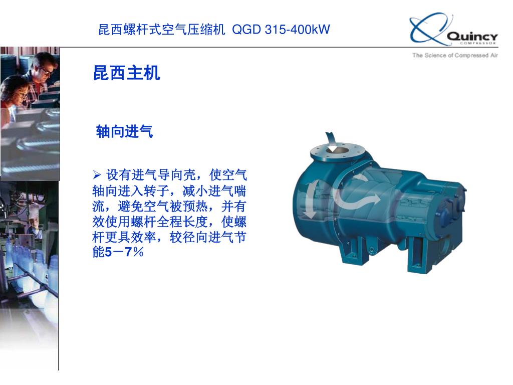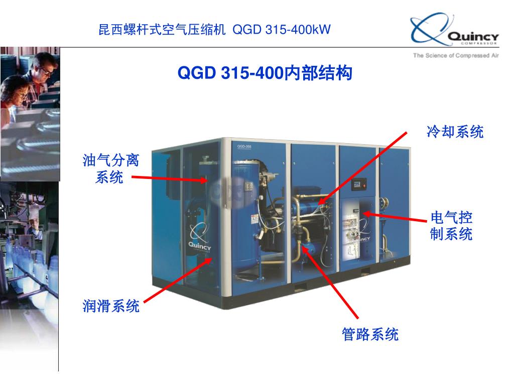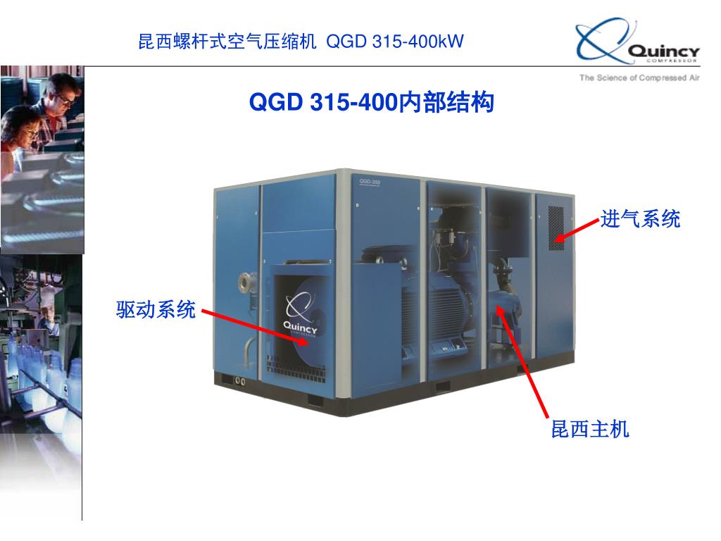 昆西螺杆式空气压缩机 QGD 315-400kW. 昆西螺杆式空气压缩机 QGD 315-400kW. 美国昆西压缩机 昆山昆泰克空气系统技术有限公司. 昆西螺杆式空气压缩机 QGD 315-400kW. 昆西全球化设计直联系列. Quincy Global Direct - QGD. 昆西全球化设计 外形美观大方 人性化设计 高效可靠 静音运行. 昆西螺杆式空气压缩机 QGD 315-400kW. QGD 315-400kW. 昆西螺杆式空气压缩机 QGD 315-400kW. QGD 315-400 内部结构. 进气系统. 驱动系统.