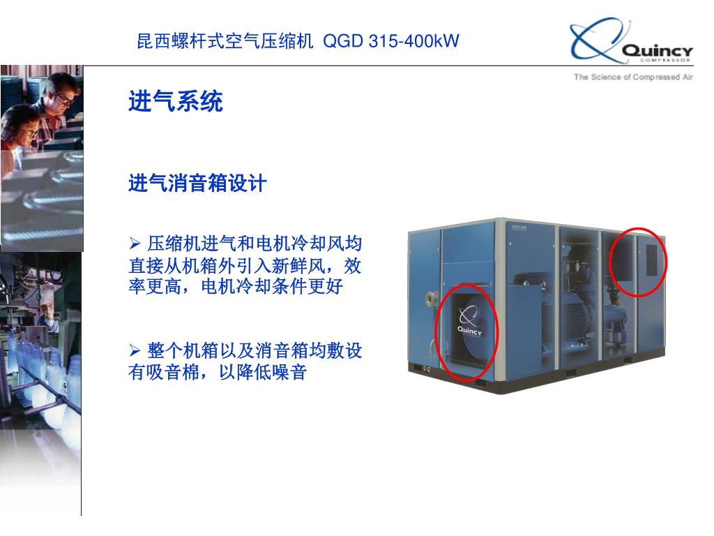昆西螺杆式空气压缩机 QGD 315-400kW 进气系统 进气消音箱设计 • 压缩机进气和电机冷却风均直接从机箱外引入新鲜风,效率更高,电机冷却条件更好 • 整个机箱以及消音箱均敷设有吸音棉,以降低噪音