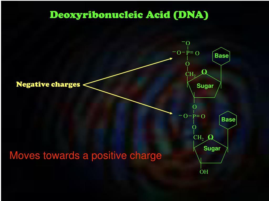 O O P O Base O O CH2 Sugar Negativecharges O O O P Base O O CH2 Sugar OH Deoxyribonucleic Acid (DNA) Moves towards a positive charge