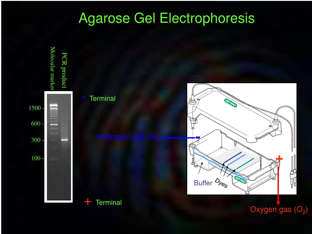 PCR product Molecular marker - -Terminal 1500 - 600 - + Hydrogen gas (H2) 300 - 100 - Buffer Dyes + Terminal Oxygen gas (O2) Agarose Gel Electrophoresis
